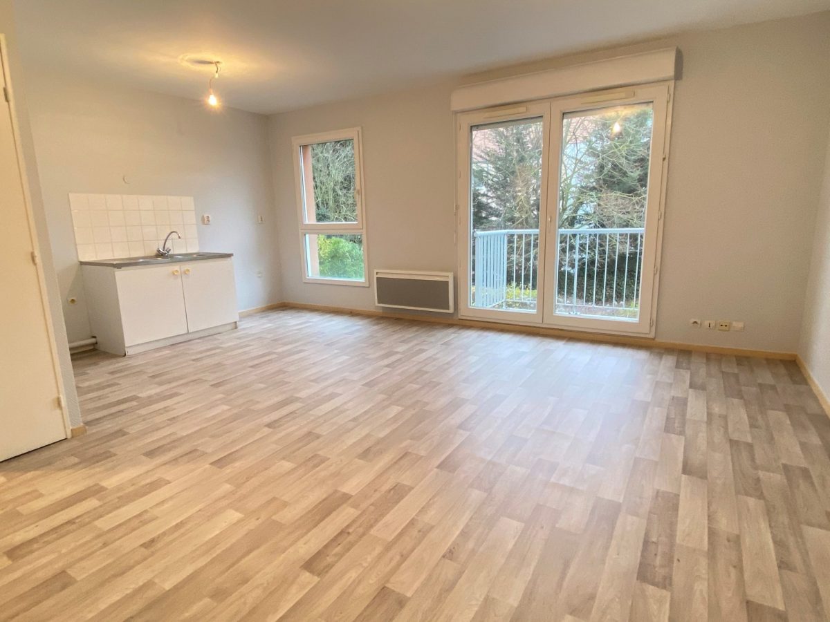 Appartement 3 pièces d’environ 54m² comprenant entrée, séjour donnant sur balcon exposé sud-ouest, coin cuisine, deux chambres, salle de bains, WC séparé.