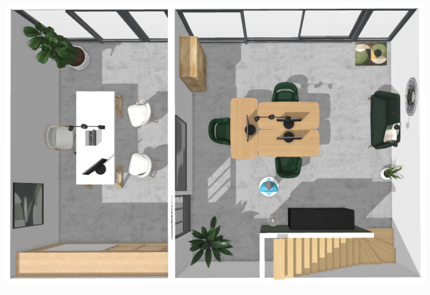 Ensemble comprenant au RDC deux bureaux avec baie vitrée, bureau de 25,98m² et de 17,47m² (ou stockage) avec lave mains (possibilité sur demande de mettre un WC).